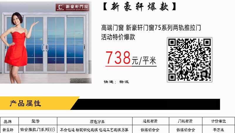 供应:高端门窗 新豪轩门窗 活动特价爆款75系列两轨推拉门特价