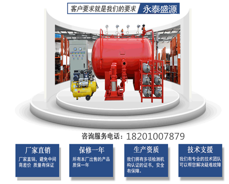 气体顶压消防设备使用的配件,经过了诸多生产厂家的筛选,具有可靠的产品质量保证,标准产品中的关键零部件,如:电机、水泵轴承、可编程控制器、断路器、接触器、继电器等采用了国内外产品;
