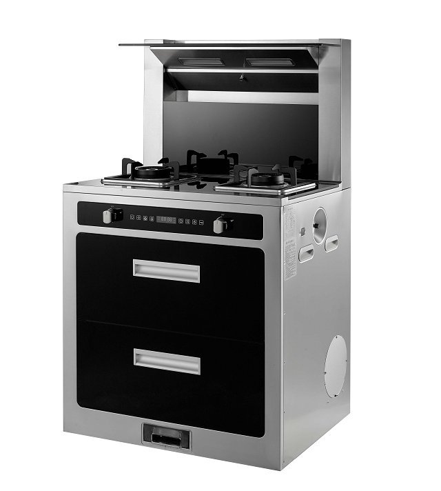 吸油烟机+燃气灶+消毒柜+储藏柜四位一体,侧、背板进口纯不锈钢。