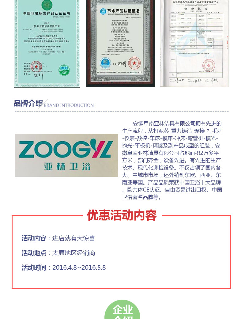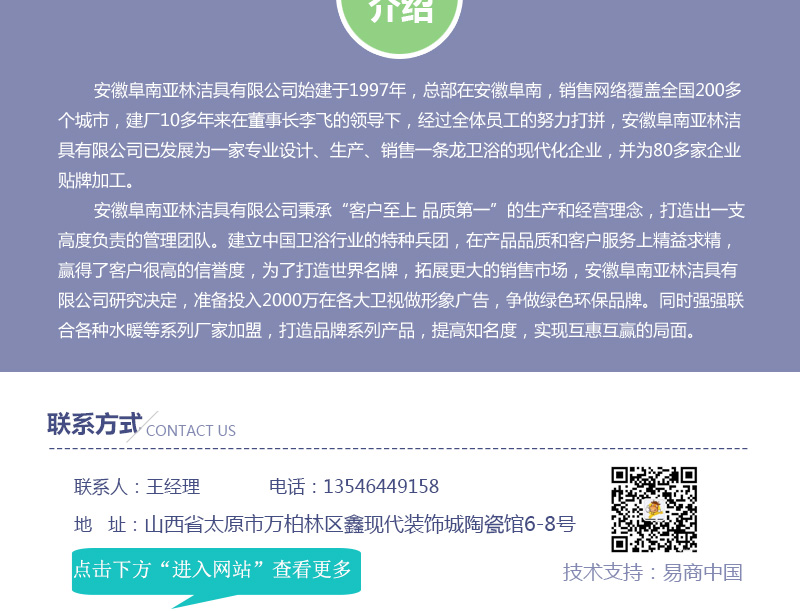 【内容摘要】 安徽阜南亚林洁具有限公司始建于1997年,总部在安徽阜南,销售网络覆盖全国200多个城市,建厂10多年来在董事长李飞的领导下,经过全体员工的努力打拼,安徽阜南亚林洁具有限公司已发展为一家专业设计、生产、销售一条龙卫浴的现代化企业,并为80多家企业贴牌加工。关键词:山西太原亚林卫浴总代理 山西太原卫浴哪家好 山西太原厨卫电器批发