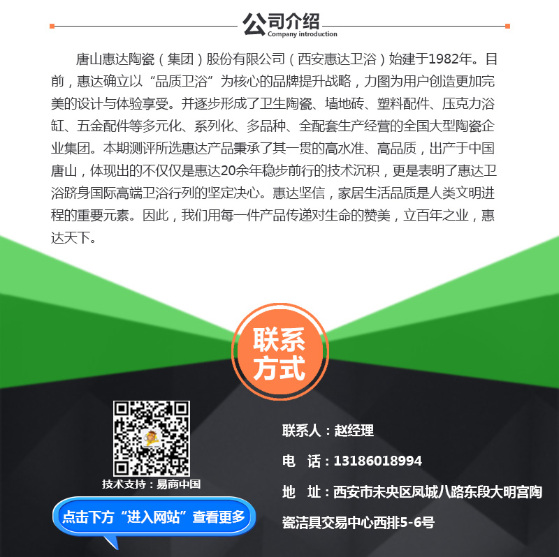 【内容摘要】唐山惠达陶瓷(集团)股份有限公司(西安惠达卫浴)始建于1982年。目前,惠达确立以“品质卫浴”为核心的品牌提升战略,力图为用户创造更加完美的设计与体验享受。并逐步形成了卫生陶瓷、墙地砖、塑料配件、压克力浴缸、五金配件等多元化、系列化、多品种、全配套生产经营的全国大型陶瓷企业集团。