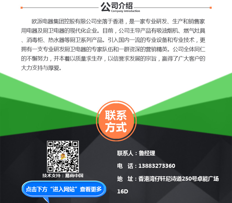【内容摘要】欧派电器集团控股有限公司坐落于香港,是一家专业研发、生产和销售家用电器及厨卫电器的现代化企业。目前,公司主导产品有吸油烟机、燃气灶具、消毒柜、热水器等厨卫系列产品。引入国内一流的专业设备和专业技术,更拥有一支专业研发厨卫电器的专家队伍和一群资深的营销精英。公司全体同仁的不懈努力,并本着以质量求生存,以信誉求发展的宗旨,赢得了广大客户的大力支持与厚爱。