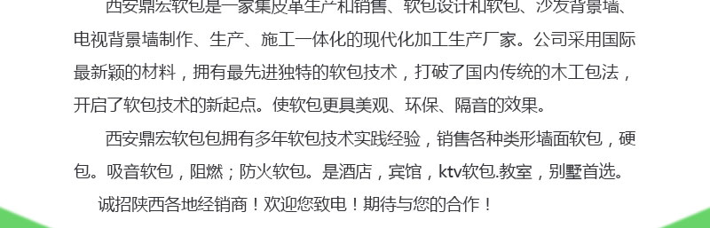 【内容摘要】西安鼎宏软包是一家集皮革生产和销售、软包设计和软包、沙发背景墙、电视背景墙制作、生产、施工一体化的现代化加工生产厂家。公司采用国际最新颖的材料,拥有最先进独特的软包技术,打破了国内传统的木工包法,开启了软包技术的新起点。使软包更具美观、环保、隔音的效果。