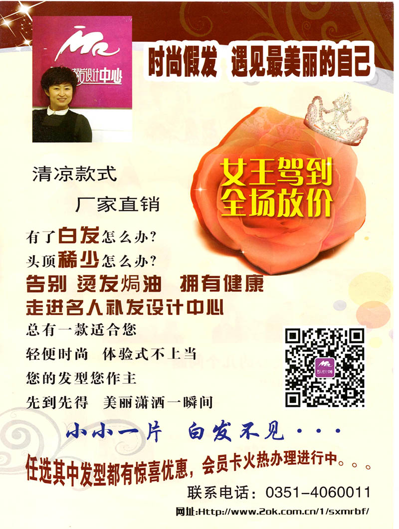 太原市迎泽区名人美容美发中心二部, 是一家集补发、接发、织发及形象设计为一体的专业补发中心。凭借高超的专业水平和成熟的技术在美发领域迅速崛起,同时还依靠不断的技术革新求发展,为客户提供更满意的服务 补发是一种高科技的物理技术,它是秃脱发在药物治疗与医疗方式解决不了根本问题的情况下,开创的一种全新的“治秃”新观念。还可做平头,毛寸等时尚发型.不仅打破了传统假发、药物与手术的缺陷,也让消费者体验一种全新头发服务方式,健康、时尚、环保、省时、逼真、多样而不伤发。织发补发原料全部采用纯天然材质制作,发质采用与阁下发质相同的纯真发,犹如同根生长,毫无造作之嫌。令您满头秀发浑然一体,如若天成尽情展现您的魅力与自信。 名人风采头发再造技术是集研发、制作、艺术、服务于一体的新型头发革命。采用的原材料均为经过68道特殊工艺处理后的健康真人发丝。经消毒、脱酸、防老化多道工艺处理后,用精细的手工技术勾织在按照顾客所修补面积制做出的仿真头皮上。将制作好的头发采用隐形锁扣、生物粘胶、自然吸附的方式固定。我中心开发了国内独创的先进 "自然"补发技术是在医疗,药物,不能治育情况下,根据您顾客头型弧度量身定做的头发,立干见影,自然逼真。令您满头秀发浑然一体,如若天成。 今天名人风采员工以“高超精堪的技术,热情周到的服务”为方针,不断开拓创新,以技术为核心、视质量为生命、奉用户为上帝,竭诚为您提供性价比最高及无微不至的服务。您给我们一份关注,我们还您一个美丽人生!