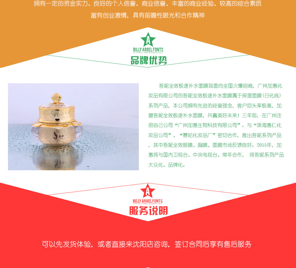 【内容摘要】吾妮高端定制化妆品全效极速补水面膜现面向全国火爆招商,广州加惠化妆品有限公司的吾妮全效极速补水面膜属于保湿面膜(日化线) 系列产品,本公司拥有先进的经营理念,客户回头率极高,加盟吾妮全效极速补水面膜,共赢美好未来!三年前,在广州注册自己公司“广州加惠生物科技有限公司”。