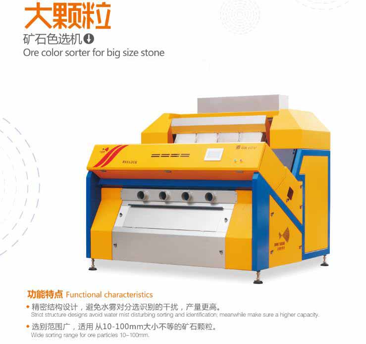 高端全彩线扫描技术,DSP+FPGA前沿处理技术,颜色和形状相结合多种模式复杂算法,针对不同矿石颗粒大小提供“色选+形选”的解决方案.