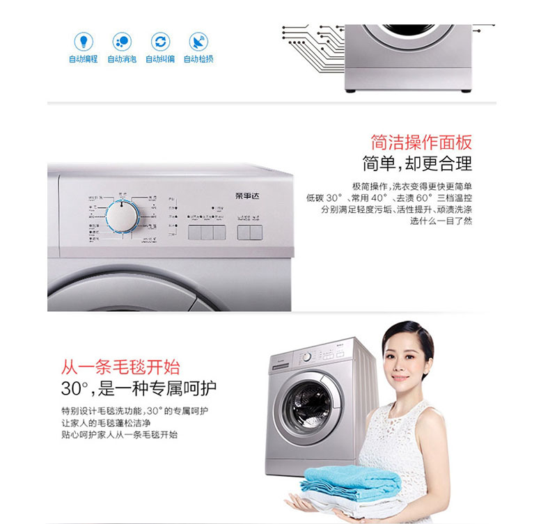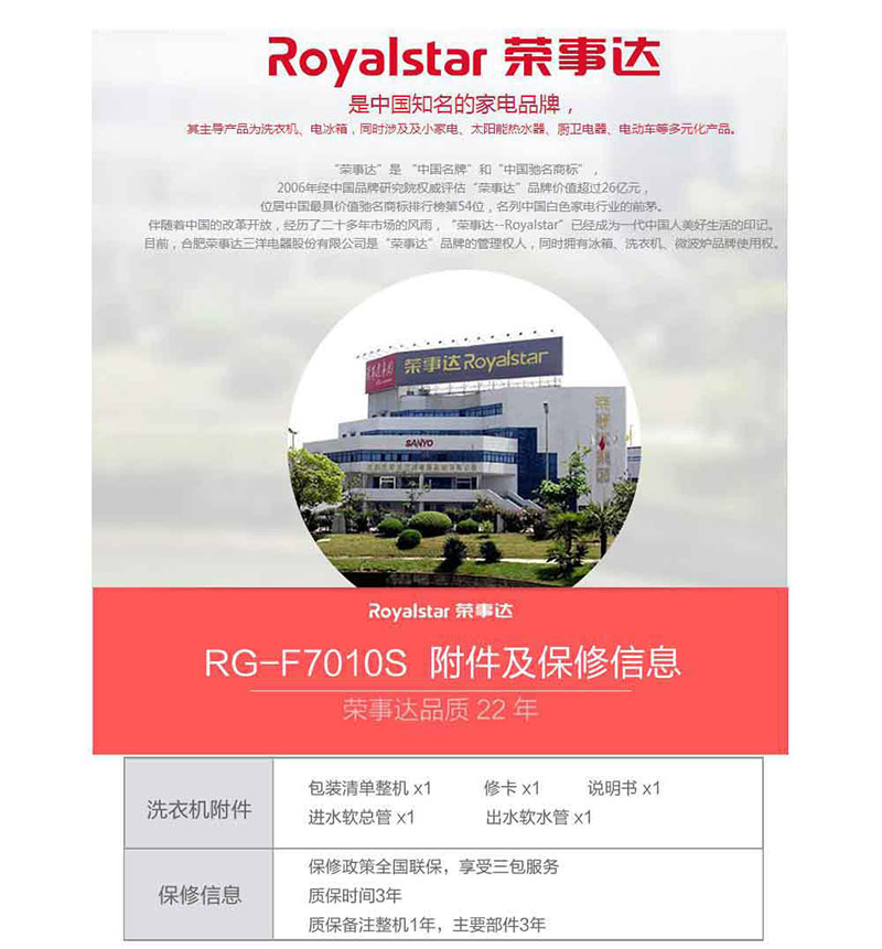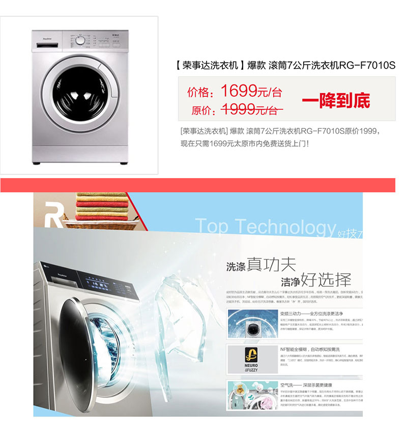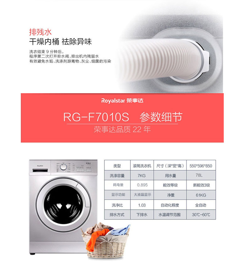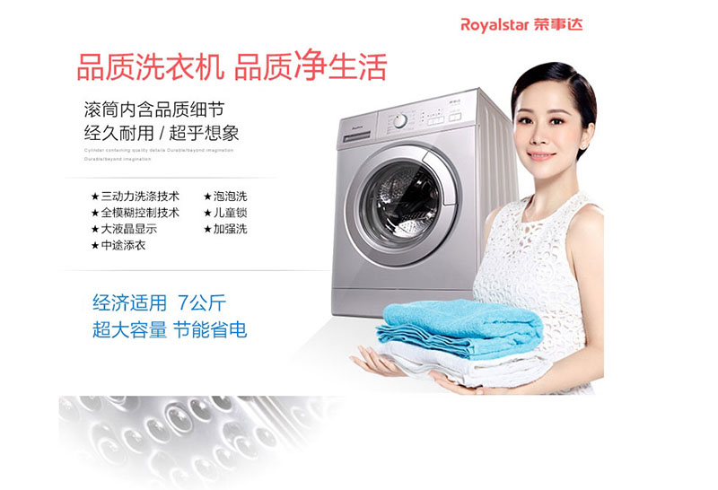供应:荣事达洗衣机爆款 滚筒7公斤洗衣机RG-F7010S原价