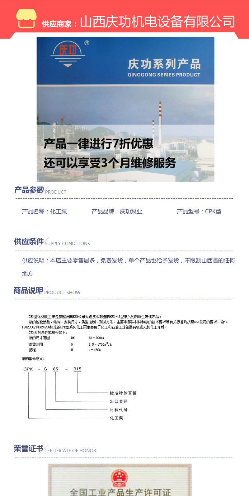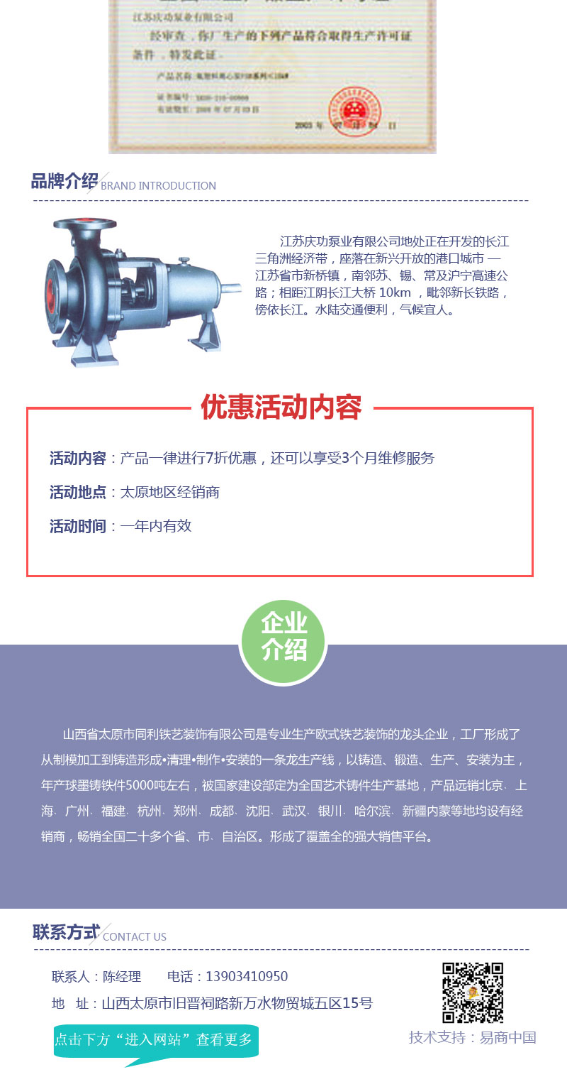 【内容摘要】山西庆功机电设备有限公司是一家集江苏省靖江市五大机泵集团公司在山西太原的直销公司。主要直销各种金属、非金属、单级、多级、单吸、双吸化工泵,主要材质有:0cr18Ni9、1cr18Ni9Ti、316、316L、CD-4MCu、904、904L、941、8#合金、20#合金、哈氏B合金、F46氟塑料合金等优质材质。品种齐全,质量过硬,服务到家,欢迎广大客户来人、来电,来函选购。 关键词:山西化工泵;太原耐酸泵;太原耐腐泵 |