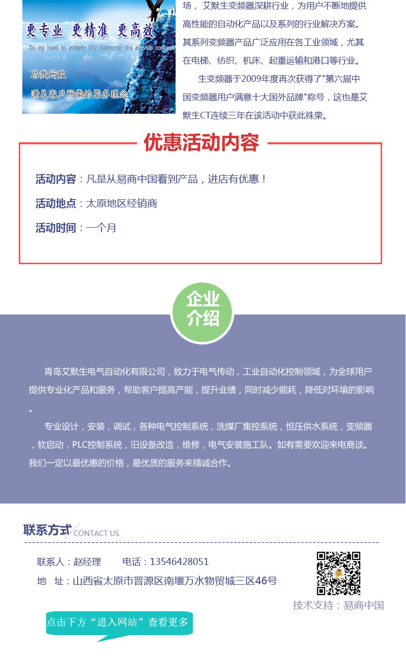 【内容摘要】 青岛艾默生电气自动化有限公司,致力于电气传动,工业自动化控制领域,为全球用户提供专业化产品和服务,帮助客户提高产能,提升业绩,同时减少能耗,降低对环境的影响。 关键词:山西哪里有卖变频器 山西太原变频器 山西承揽变频器工程 |