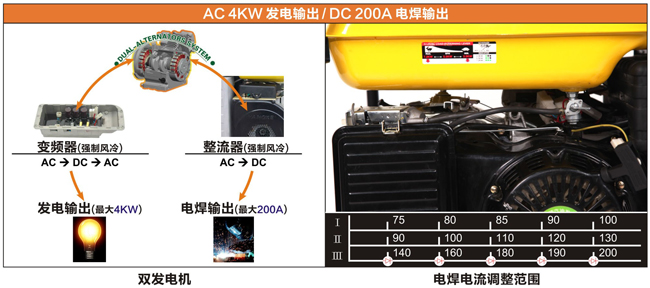 2. 轻巧便携:狮虎数码变频汽油发电机组采用全球独创专利技术—----双发电机并联输出设计,使整机体积更加轻巧,紧凑;