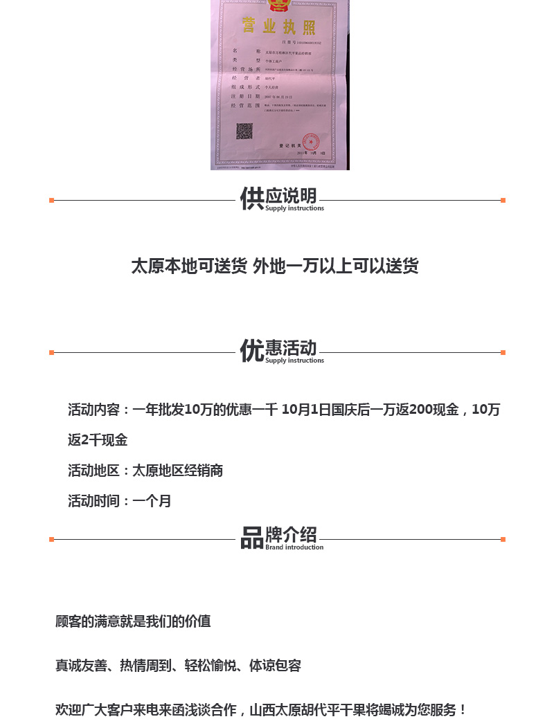 【内容摘要】最大的,最便宜的干果批发市场。经营理念: 诚信为本,服务至上,精进卓越,亲和共生 服务理念: 顾客的满意就是我们的价 真诚友善、热情周到、轻松愉悦、体谅包容 专业化、规范化、精细化、亲情化