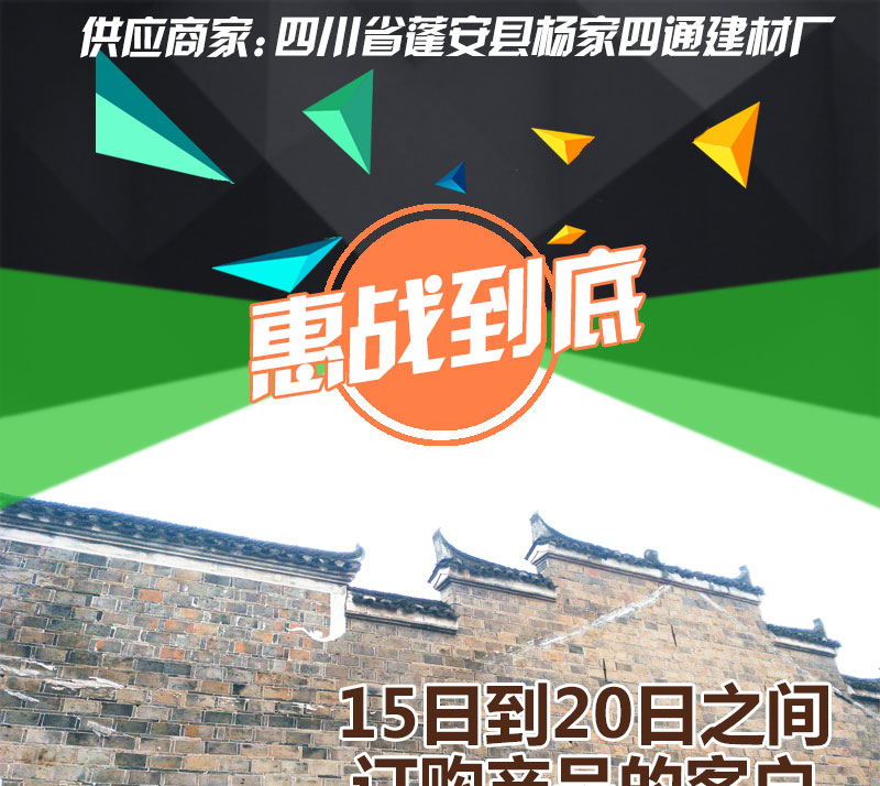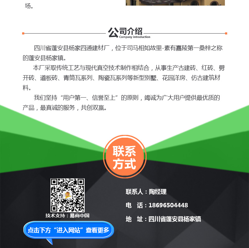 【内容摘要】四川省蓬安县杨家四通建材厂,位于司马相如故里-素有嘉陵第一桑梓之称的蓬安县杨家镇。本厂采取传统工艺与现代真空技术制作相结合,从事生产古建砖、红砖、劈开砖、道板砖、青筒瓦系列、陶瓷瓦系列等新型别墅、花园洋房、仿古建筑材料。