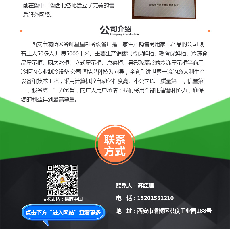 【内容摘要】西安市灞桥区冷鲜星星制冷设备厂是一家生产销售商用家电产品的公司,现有工人50多人.厂房5000平米。主要生产销售制冷保鲜柜、熟食保鲜柜、冷冻食品展示柜、厨房冰柜、立式展示柜、点菜柜、异形玻璃冷藏冷冻展示柜等商用冷柜的专业制冷设备.公司坚持以科技为向导,全套引进世界一流的意大利生产设备和技术工艺,采用计算机控自动化程度高。本公司以“质量第一,信誉第一,服务第一”为宗旨,向广大用户承诺:我们将用全部的智慧和心力,确保您的利益得到最高尊重。