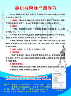 一、优特点:操作简单、移动方便、坚固耐用。可折叠托行、升降,集一字梯、人字梯、凳梯三种功能于一体。本产品采用镀锌材料、经过喷涂防腐处理。