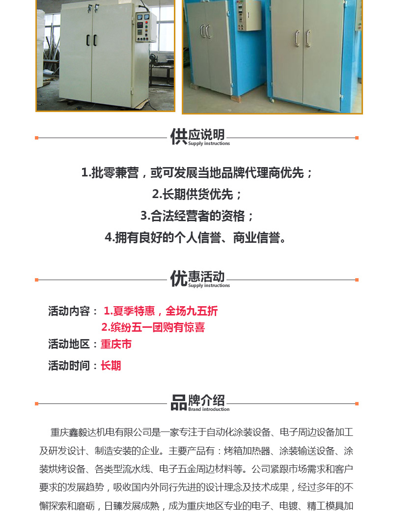【内容摘要】重庆鑫毅达机电有限公司是一家专注于自动化涂装设备、电子周边设备加工及研发设计、制造安装的企业。主要产品有:烤箱加热器、涂装输送设备、涂装烘烤设备、各类型流水线、电子五金周边材料等。公司紧跟市场需求和客户要求的发展趋势,吸收国内外同行先进的设计理念及技术成果,经过多年的不懈探索和磨砺,日臻发展成熟,成为重庆地区专业的电子、电镀、精工模具加工的制造厂商。