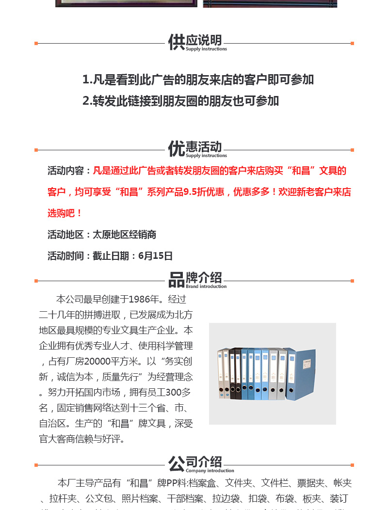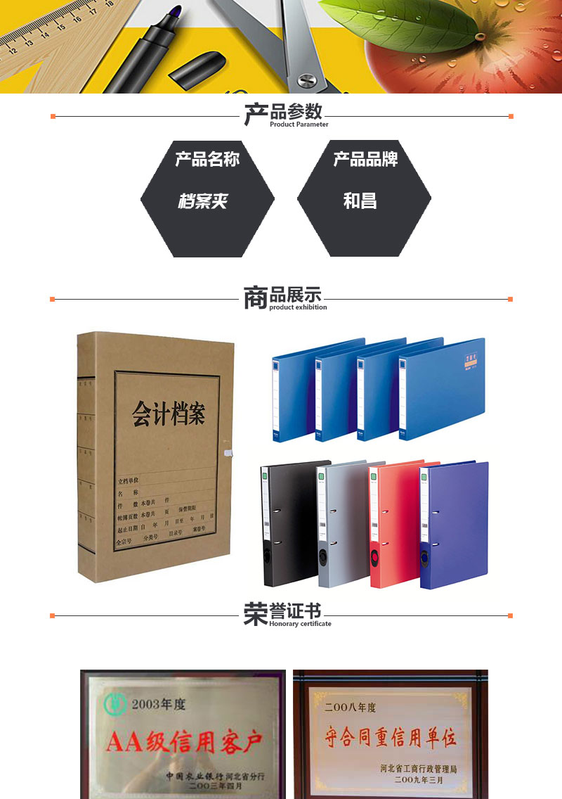 【内容摘要】本厂主导产品有“和昌”牌PP料:档案盒、文件夹、文件栏、票据夹、帐夹、拉杆夹、公文包、照片档案、干部档案、拉边袋、扣袋、布袋、板夹、装订线、牛皮卡、档案盒(2—6cm)、卷皮、卷宗、档案袋、文件袋、资料袋、凭证盒 (信封、档案袋、卷皮、会计凭证、档案角)。本厂注重科技投入致力于集产品开发、生产、销售、加工、服务于一体。产品款式新颖、不断开拓创新,使“和昌”牌文具至臻至美。
