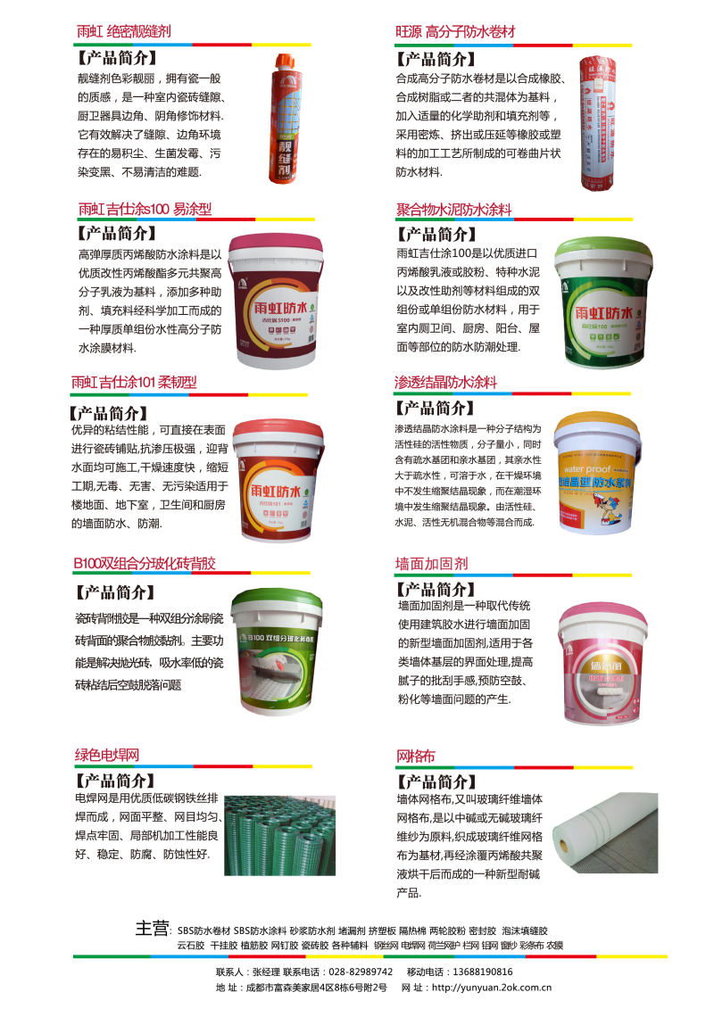主营:成都雨虹防水涂料批发|成都网格布批发|成都沥青防水卷材批发|成都钢丝网批发|成都电焊网批发|成都防水涂料批发|成都安全网批发|四川防水涂料工程|四川防水涂料代理