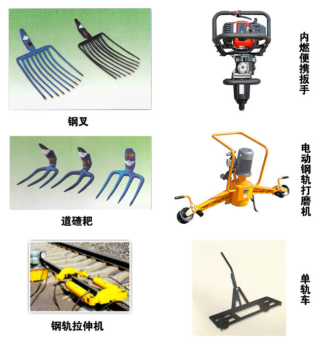铁路设备 ,养路机械设备等及工矿配件,建筑工具等。现主要供应产品有:内燃螺栓扳手 内燃捣固镐 内燃切轨机 内燃