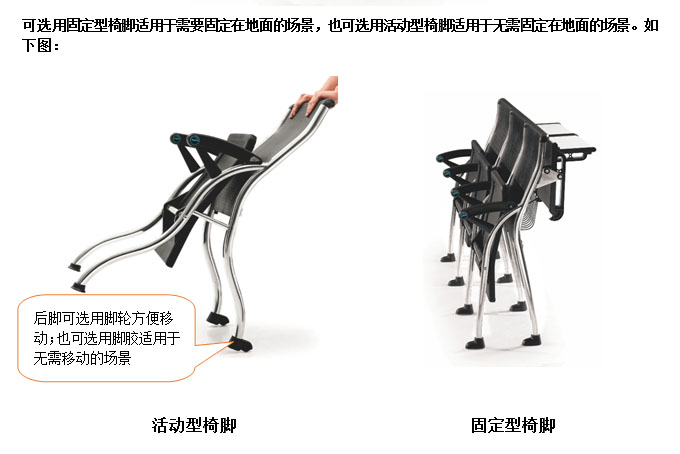 2、椅脚:前脚管采用T1.2mm?Φ28mm 不锈钢管,后脚管采用T1.2mm?Φ32不锈钢管。可选用固定型椅脚适用于固定在地面,也可选用活动型椅脚适用于无需固定在地面的场景。