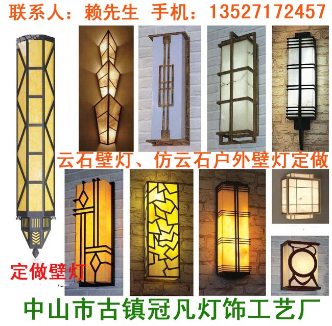 中山市古镇冠凡灯饰工艺厂专业生产销售:云石壁灯、云石户外壁灯、外墙户外壁灯、酒店工程壁灯、客户壁灯、仿云石户外壁灯、庭院灯、LED路灯、房地产外墙户外壁灯、太阳能户外灯等系列产品,产品广泛应用于房地产小区外墙、园林公园、建筑物外墙、市政广场、别墅小区等场所!欢迎来图来电订做各种户外照明灯具!