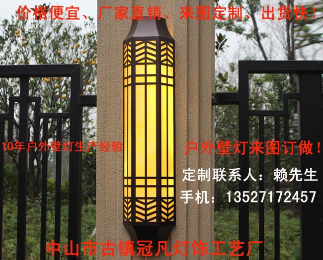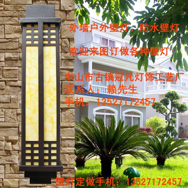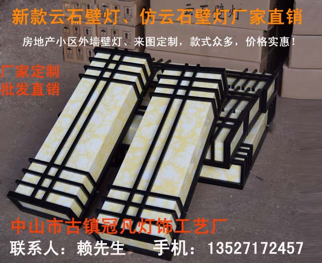 中山市古镇冠凡灯饰工艺厂专业生产销售:云石壁灯、云石户外壁灯、外墙户外壁灯、酒店工程壁灯、客户壁灯、仿云石户外壁灯、庭院灯、LED路灯、房地产外墙户外壁灯、太阳能户外灯等系列产品,产品广泛应用于房地产小区外墙、园林公园、建筑物外墙、市政广场、别墅小区等场所!欢迎来图来电订做各种户外照明灯具!