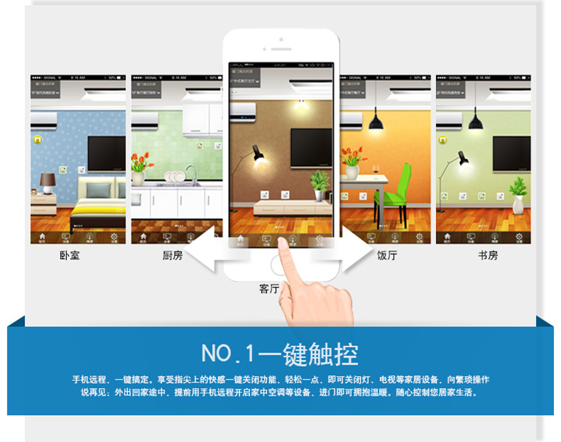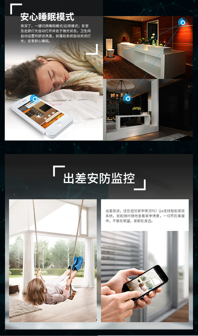 无线互联网控制技术,通过简约、个性的APP界面,对您家中的照明、窗帘、地暖、电视、空调、音响等进行远程控制。