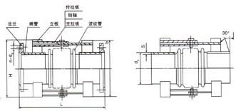 平面铰链波纹补偿器是由接管、波纹管及与接管相连的一对铰链构成。补偿器的铰链具有承受内压推力的能力。 性能特点: 平面铰链波纹补偿器用于吸收单平面的角向位移。 安装使用注意事项: 1.不锈钢波纹补偿器两个或三个配套使用。 2.安装时不锈钢补偿器的铰链转动平面必须与位移平面一致。