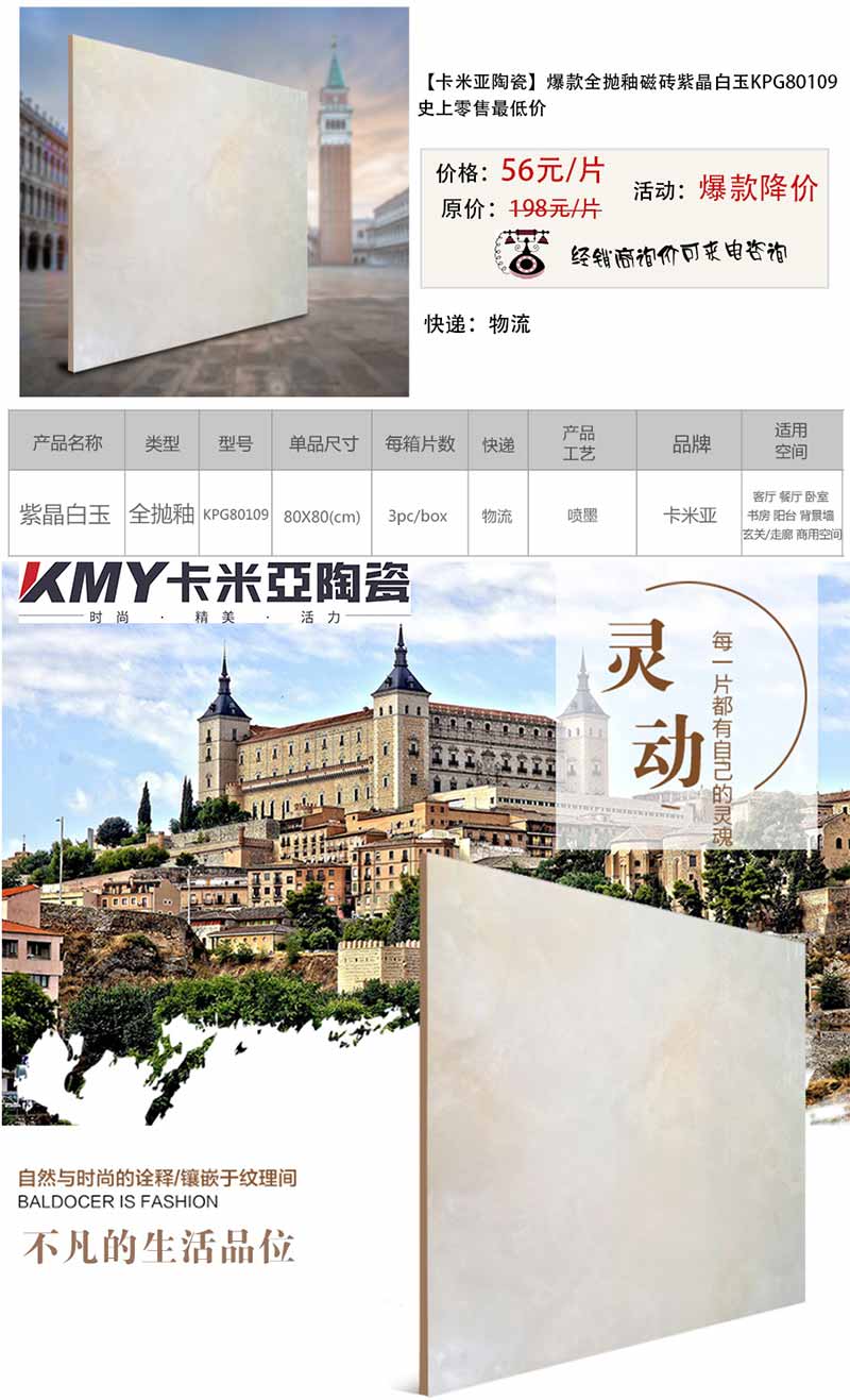 【内容摘要】【卡米亚陶瓷】爆款全抛釉磁砖紫晶白玉KPG80109原价198元/片,现价仅需56元/片,经销商上货部分样品免费,价格另议