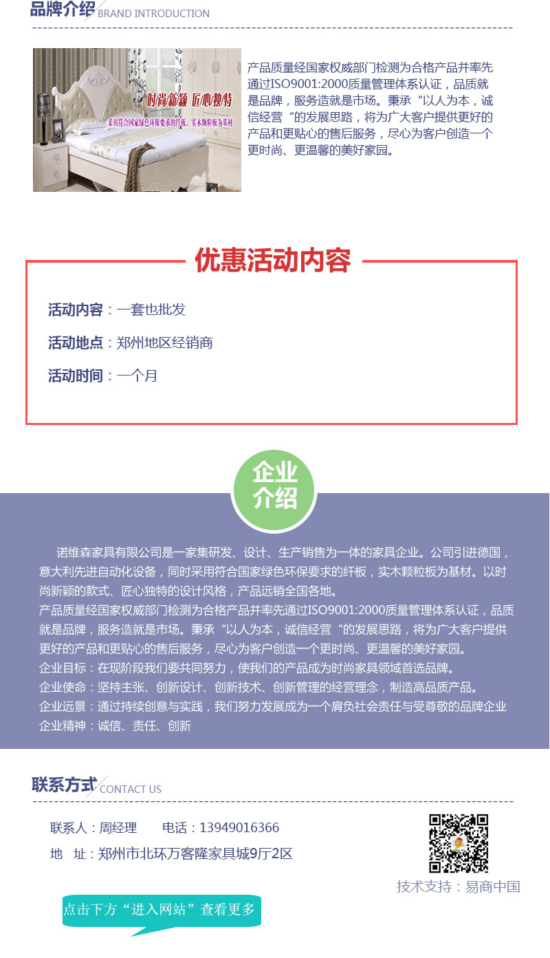 【内容摘要】诺维森家具有限公司是一家集研发、设计、生产销售为一体的家具企业。公司引进德国,意大利先进自动化设备,同时采用符合国家绿色环保要求的纤板,实木颗粒板为基材。以时尚新颖的款式、匠心独特的设计风格,产品远销全国各地。 产品质量经国家权威部门检测为合格产品并率先通过ISO9001:2000质量管理体系认证,品质就是品牌,服务造就是市场。秉承“以人为本,诚信经营“的发展思路,将为广大客户提供更好的产品和更贴心的售后服务,尽心为客户创造一个更时尚、更温馨的美好家园。 企业目标:在现阶段我们要共同努力,使我们的产品成为时尚家具领域首选品牌。 企业使命:坚持主张、创新设计、创新技术、创新管理的经营理念,制造高品质产品。 企业远景:通过持续创意与实践,我们努力发展成为一个肩负社会责任与受尊敬的品牌企业! 企业精神:诚信、责任、创新 |