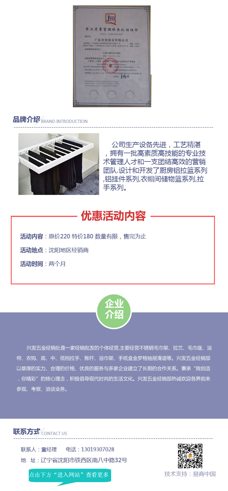 【内容摘要】兴发五金经销处是一家经销批发的个体经营,主要经营不锈钢毛巾架、拉兰、毛巾座、浴帘、衣钩、高、中、低档拉手、账杆、浴巾架、手纸盒金梦格抽屉滑道等。兴发五金经销部以雄厚的实力、合理的价格、优良的服务与多家企业建立了长期的合作关系。秉承“我创造,你精彩”的核心理念,积极倡导现代时尚的生活文化。兴发五金经销部热诚欢迎各界前来参观、考察、洽谈业务。 关键词:沈阳拉手批发|沈阳卫浴挂件批发|沈阳衣帽钩批发 |