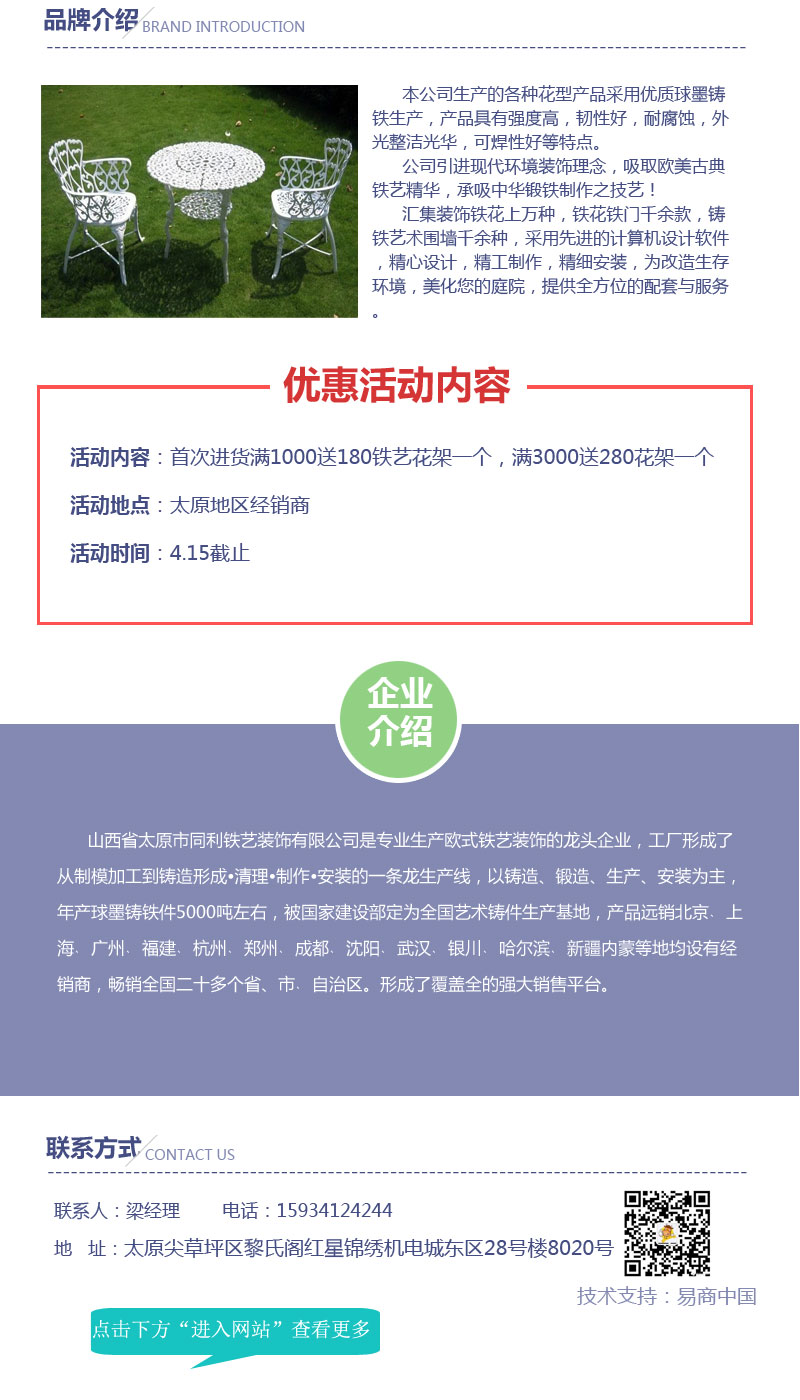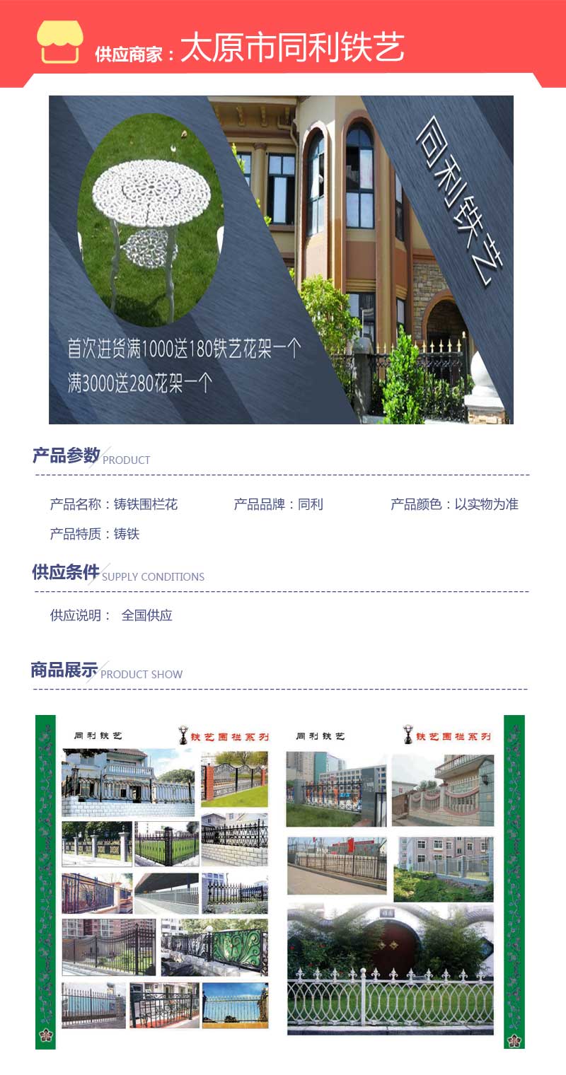 | 【内容摘要】山西省太原市同利铁艺装饰有限公司是专业生产欧式铁艺装饰的龙头企业,工厂形成了从制模加工到铸造形成•清理•制作•安装的一条龙生产线,以铸造、锻造、生产、安装为主,年产球墨铸铁件5000吨左右,被国家建设部定为全国艺术铸件生产基地,产品远销北京﹑上海﹑广州﹑福建﹑杭州﹑郑州﹑成都﹑沈阳﹑武汉﹑银川﹑哈尔滨﹑新疆内蒙等地均设有经销商,畅销全国二十多个省、市﹑自治区。形成了覆盖全的强大销售平台。 关键词:太原最大的铁艺经销部,太原铁艺阳台护栏,太原铁艺围栏 |
