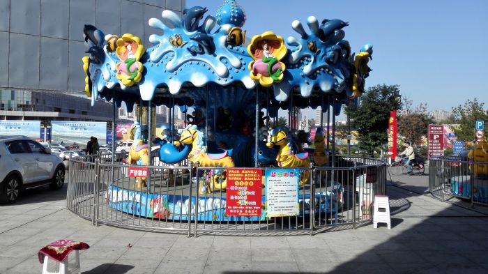 旋转海马是模拟跑马厅的娱乐活动而设计的,设备启动后,金光银光,闪闪相映,马群,马车竞相赛跑,形成一个万马奔腾的场面,乘客如同参加一场跑马比赛,无不感到心旷神怡,乐趣无穷