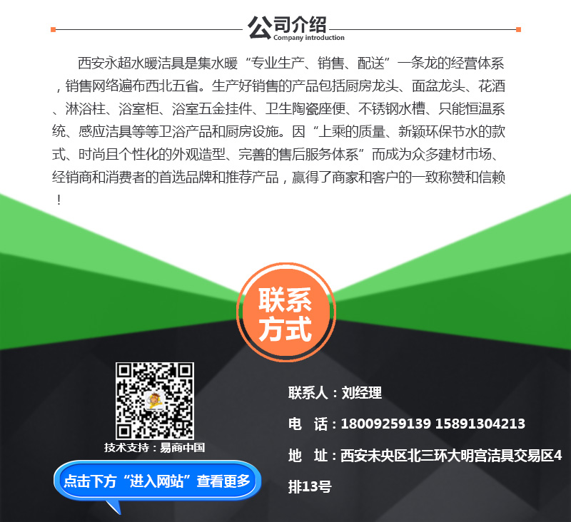 【内容摘要】西安永超水暖洁具是集水暖“专业生产、销售、配送”一条龙的经营体系,销售网络遍布西北五省。生产好销售的产品包括厨房龙头、面盆龙头、花酒、淋浴柱、浴室柜、浴室五金挂件、卫生陶瓷座便、不锈钢水槽、只能恒温系统、感应洁具等等卫浴产品和厨房设施。