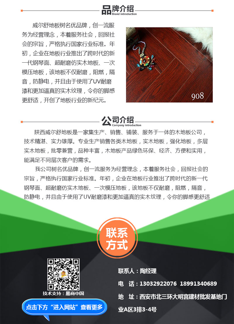【内容摘要】陕西威尔舒地板是一家集生产、销售、铺装、服务于一体的木地板公司,技术精湛、实力雄厚。专业生产销售各类木地板,实木地板,强化地板,多层实木地板,批零兼营,品种丰富,木地板产品绿色环保、经济、方便和实用,能满足不同层次客户的需求。
