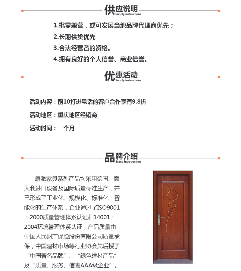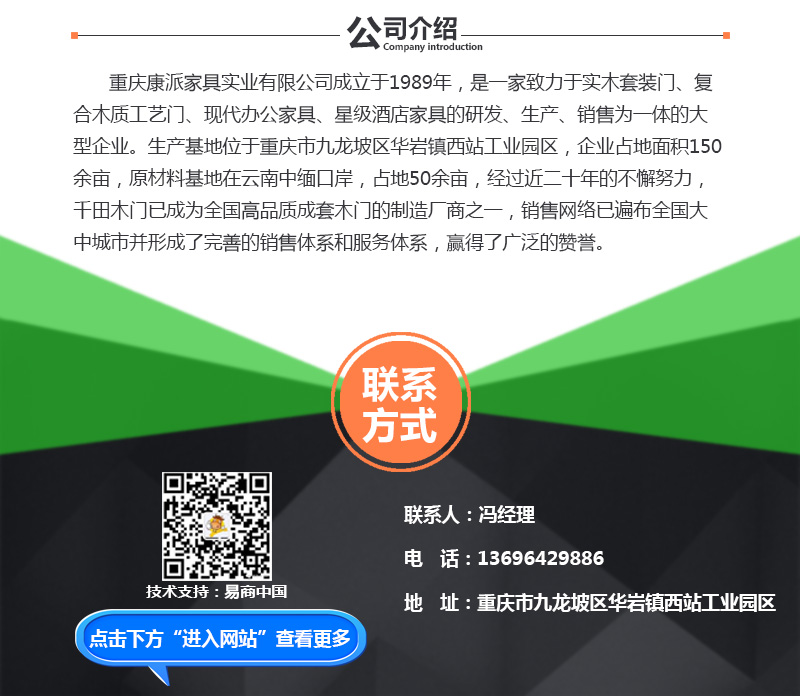 【内容摘要】重庆康派家具实业有限公司成立于1989年,是一家致力于实木套装门、复合木质工艺门、现代办公家具、星级酒店家具的研发、生产、销售为一体的大型企业。生产基地位于重庆市九龙坡区华岩镇西站工业园区,企业占地面积150余亩,原材料基地在云南中缅口岸,占地50余亩,经过近二十年的不懈努力,千田木门已成为全国高品质成套木门的制造厂商之一,销售网络已遍布全国大中城市并形成了完善的销售体系和服务体系,赢得了广泛的赞誉。