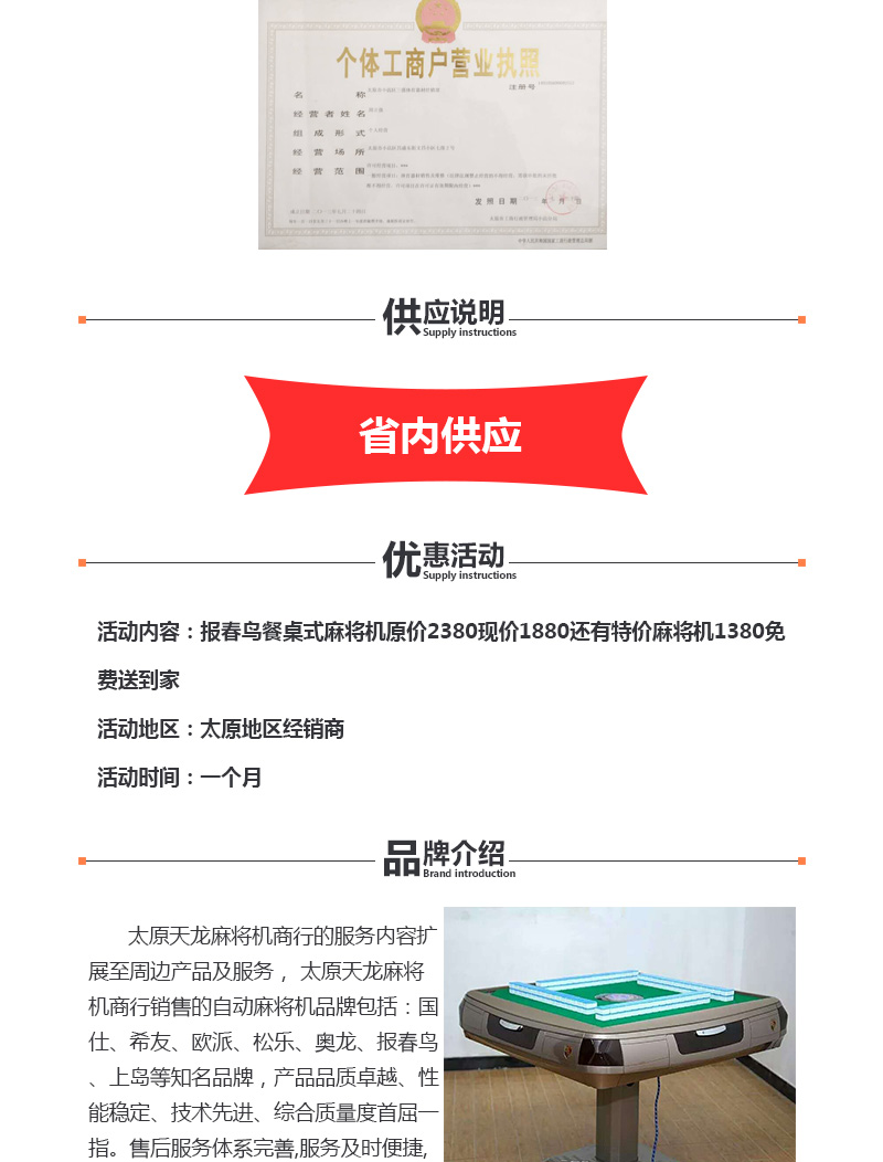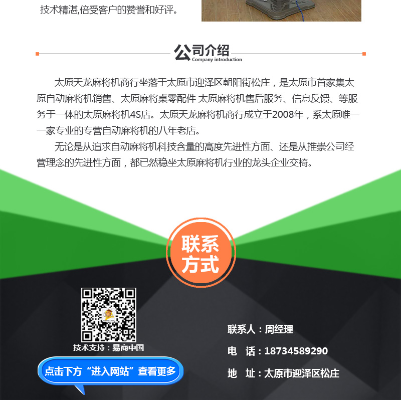 【内容摘要】太原天龙麻将机商行坐落于太原市迎泽区朝阳街松庄,是太原市首家集太原自动麻将机销售、太原麻将桌零配件 太原麻将机售后服务、信息反馈、等服务于一体的太原麻将机4S店。太原天龙麻将机商行成立于2008年,系太原唯一一家专业的专营自动麻将机的八年老店。