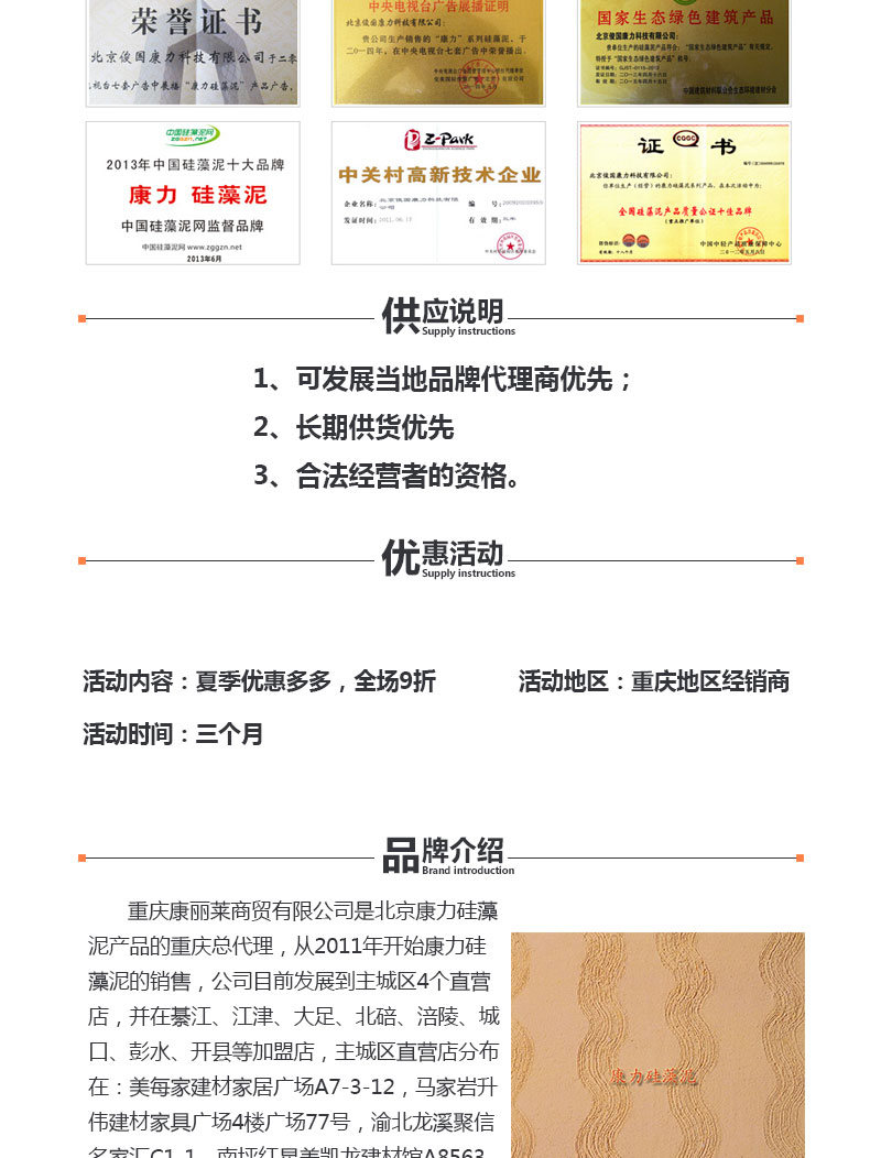 供应:重庆康丽莱商贸有限公司大量供应康力硅藻泥夏季优惠多多,全