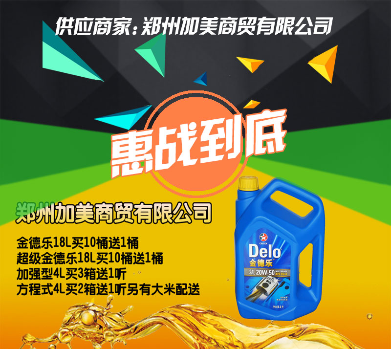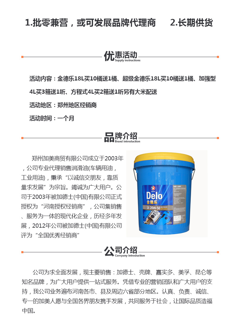 【内容摘要】郑州加美商贸有限公司成立于2003年,公司专业代理销售润滑油(车辆用油,工业用油),秉承“以诚信交朋友,靠质量求发展”为宗旨。竭诚为广大用户。 公司于2003年被加德士(中国)有限公司正式授权为“河南授权经销商”,公司集销售、服务为一体的现代化企业,历经多年发展,2012年公司被加德士(中国)有限公司评为“全国优秀经销商”
