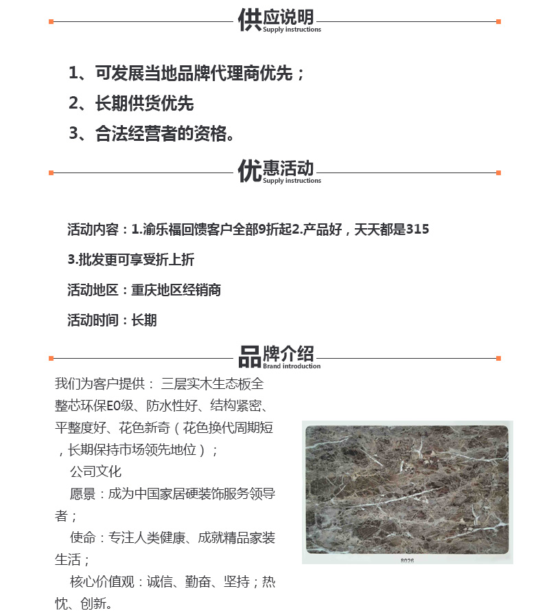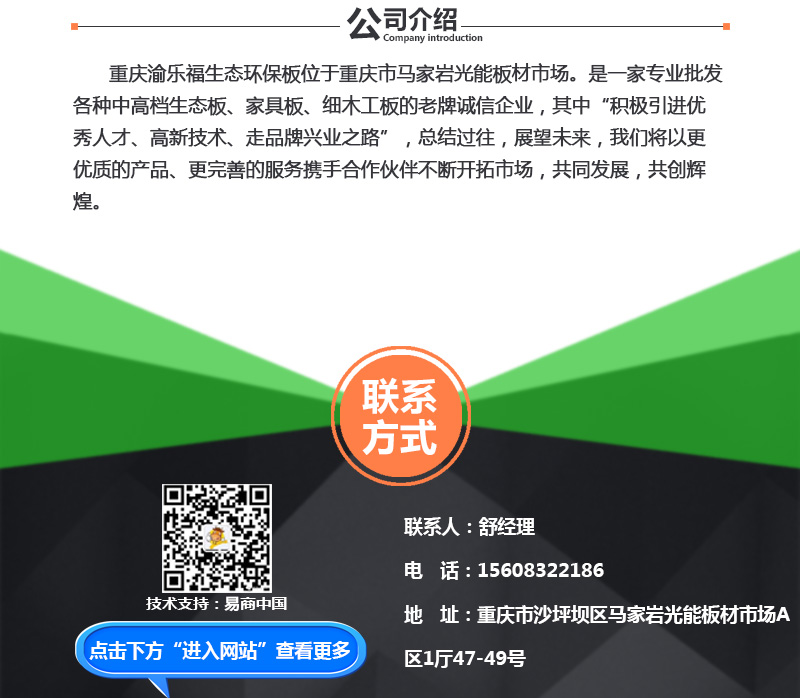 【内容摘要】重庆渝乐福生态环保板位于重庆市马家岩光能板材市场。是一家专业批发各种中高档生态板、家具板、细木工板的老牌诚信企业,其中“积极引进优秀人才、高新技术、走品牌兴业之路”,总结过往,展望未来,我们将以更优质的产品、更完善的服务携手合作伙伴不断开拓市场,共同发展,共创辉煌。