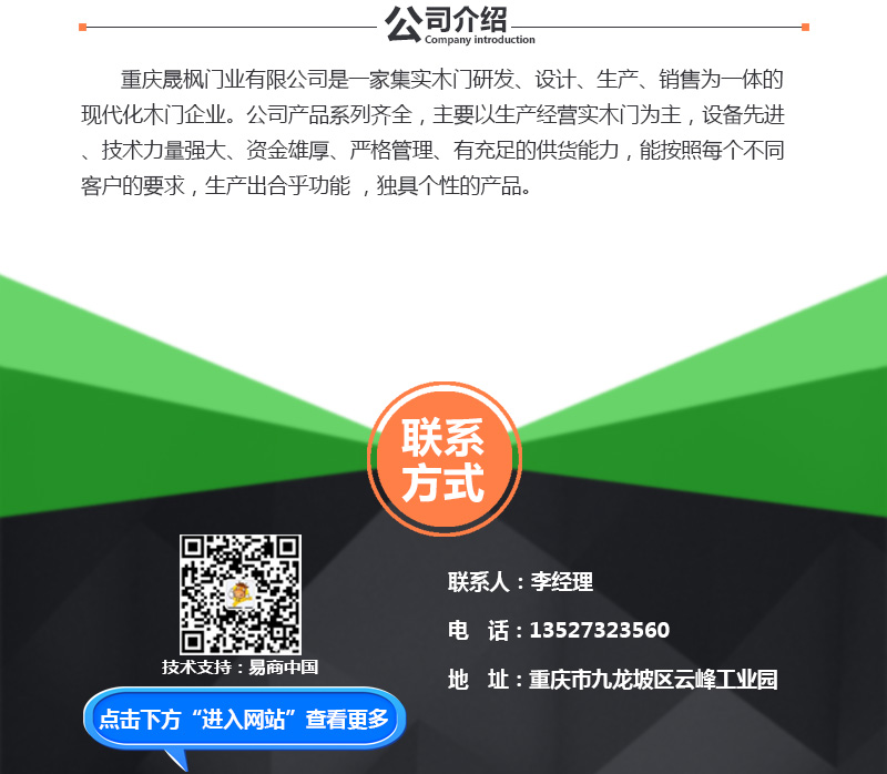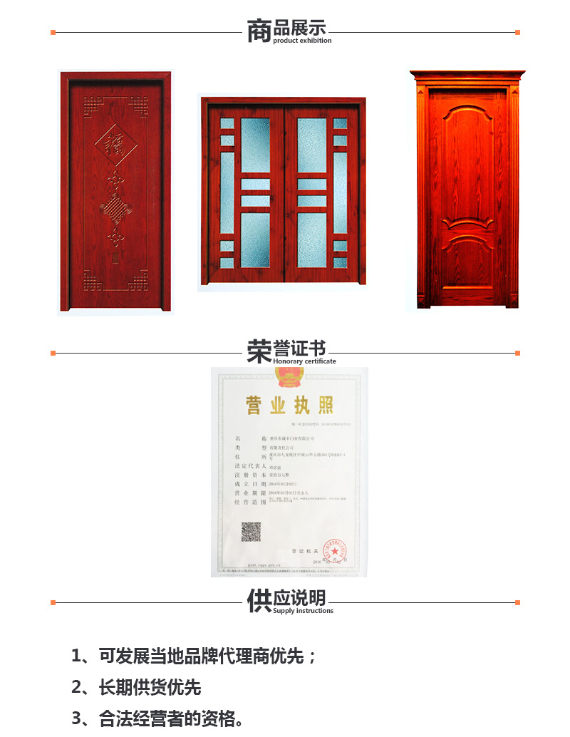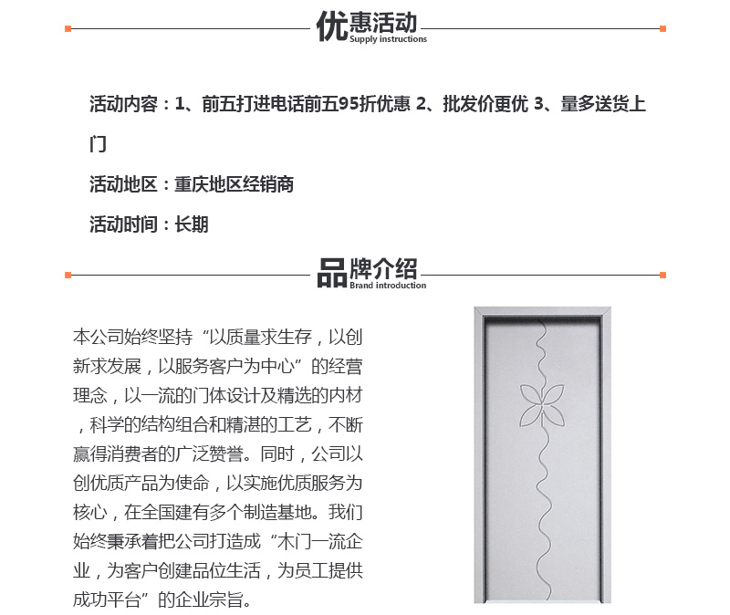 【内容摘要】本公司始终坚持“以质量求生存,以创新求发展,以服务客户为中心”的经营理念,以一流的门体设计及精选的内材,科学的结构组合和精湛的工艺,不断赢得消费者的广泛赞誉。同时,公司以创优质产品为使命,以实施优质服务为核心,在全国建有多个制造基地。我们始终秉承着把公司打造成“木门一流企业,为客户创建品位生活,为员工提供成功平台”的企业宗旨。