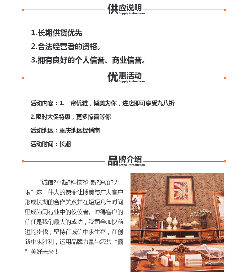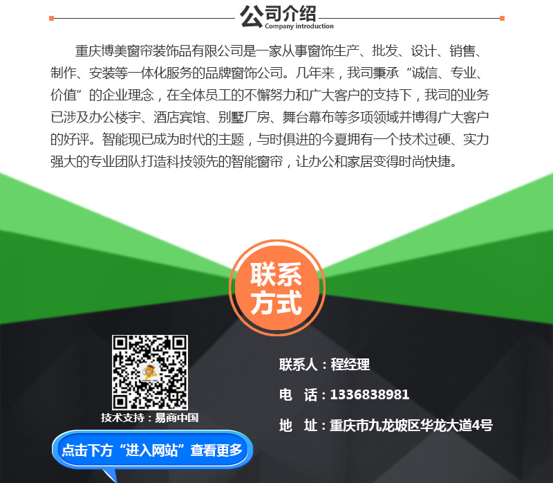 【内容摘要】重庆博美窗帘装饰品有限公司是一家从事窗饰生产、批发、设计、销售、制作、安装等一体化服务的品牌窗饰公司。几年来,我司秉承“诚信、专业、价值”的企业理念,在全体员工的不懈努力和广大客户的支持下,我司的业务已涉及办公楼宇、酒店宾馆、别墅厂房、舞台幕布等多项领域并博得广大客户的好评。智能现已成为时代的主题,与时俱进的今夏拥有一个技术过硬、实力强大的专业团队打造科技领先的智能窗帘,让办公和家居变得时尚快捷。