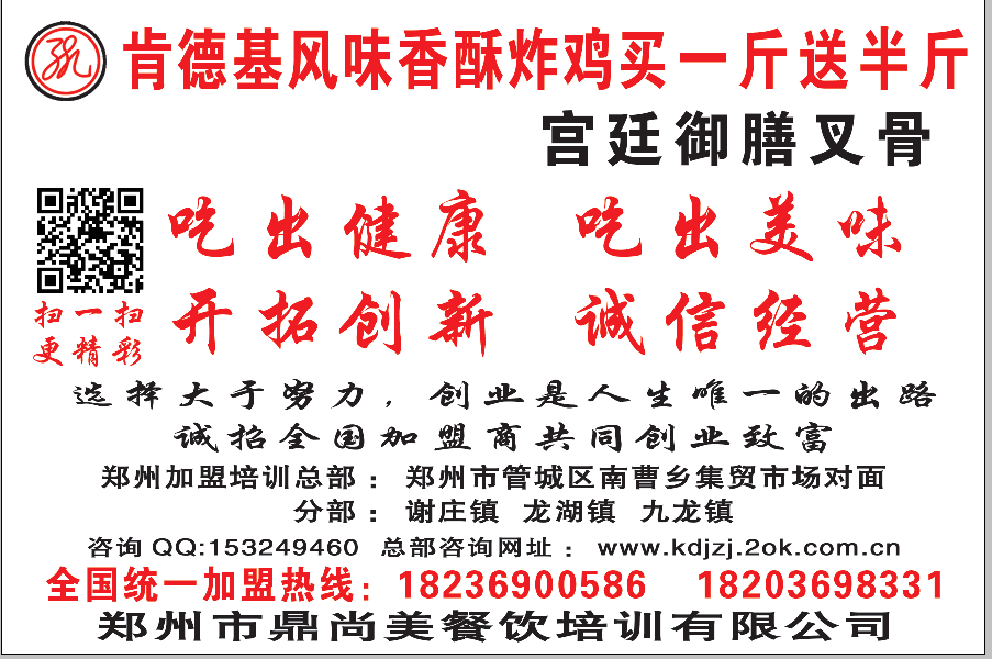 火爆品牌肯德基风味炸鸡买一斤送半斤/宫廷御膳叉骨总部在郑州市直接经营有二十家摊位或店面,进行实体店经营,现场实战教学,加盟商遍布全国各地,师资,实战力量雄厚。