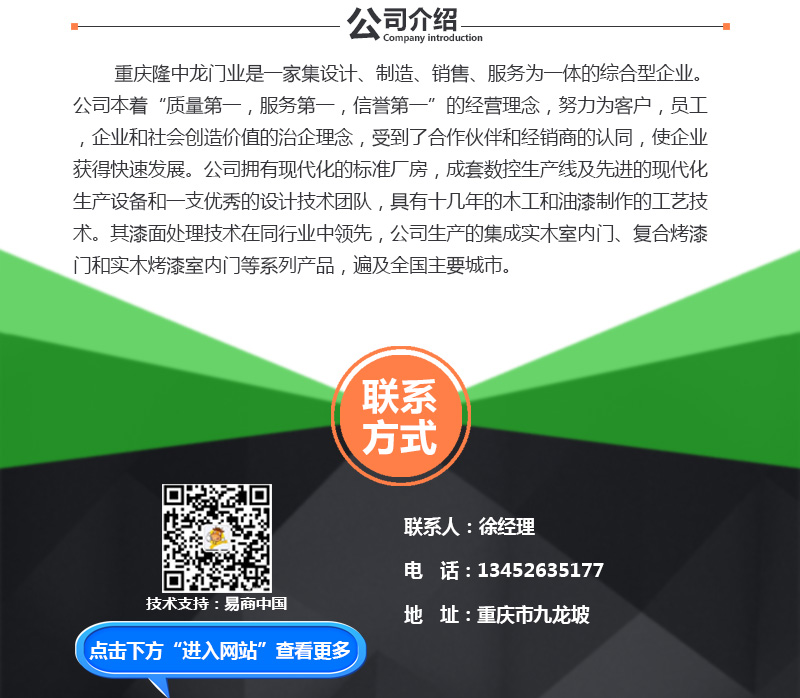 【内容摘要】重庆隆中龙门业是一家集设计、制造、销售、服务为一体的综合型企业。公司本着“质量第一,服务第一,信誉第一”的经营理念,努力为客户,员工,企业和社会创造价值的治企理念,受到了合作伙伴和经销商的认同,使企业获得快速发展。
