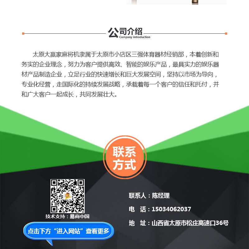 【内容摘要】太原大赢家麻将机隶属于太原市小店区三强体育器材经销部,本着创新和务实的企业理念,努力为客户提供高效、智能的娱乐产品,最具实力的娱乐器材产品制造企业,立足行业的快速增长和巨大发展空间,坚持以市场为导向,专业化经营,走国际化的持续发展战略,承载着每一个客户的信任和托付,并和广大客户一起成长,共同发展壮大。