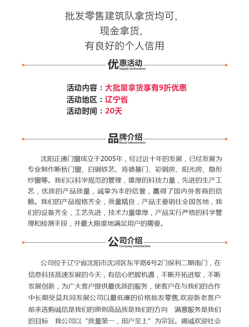 【内容摘要】沈阳正通门窗成立于2005年,经过近十年的发展,已经发展为专业制作断桥门窗、白钢铁艺、肯德基门、彩钢房、阳光房、隐形纱窗等。我们以科学规范的管理,雄厚的科技力量,先进的生产工艺,优质的产品质量,诚挚为本的信誉,羸得了国内外客商的信赖。我们的产品规格齐全,质量精良,产品主要销往全国各地,我们的设备齐全,工艺先进,技术力量雄厚,产品实行严格的科学管理和检测手段,并最大限度地满足用户的需要。