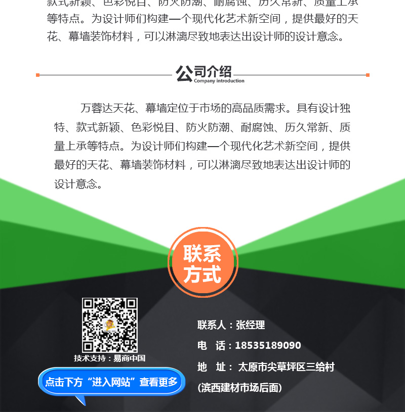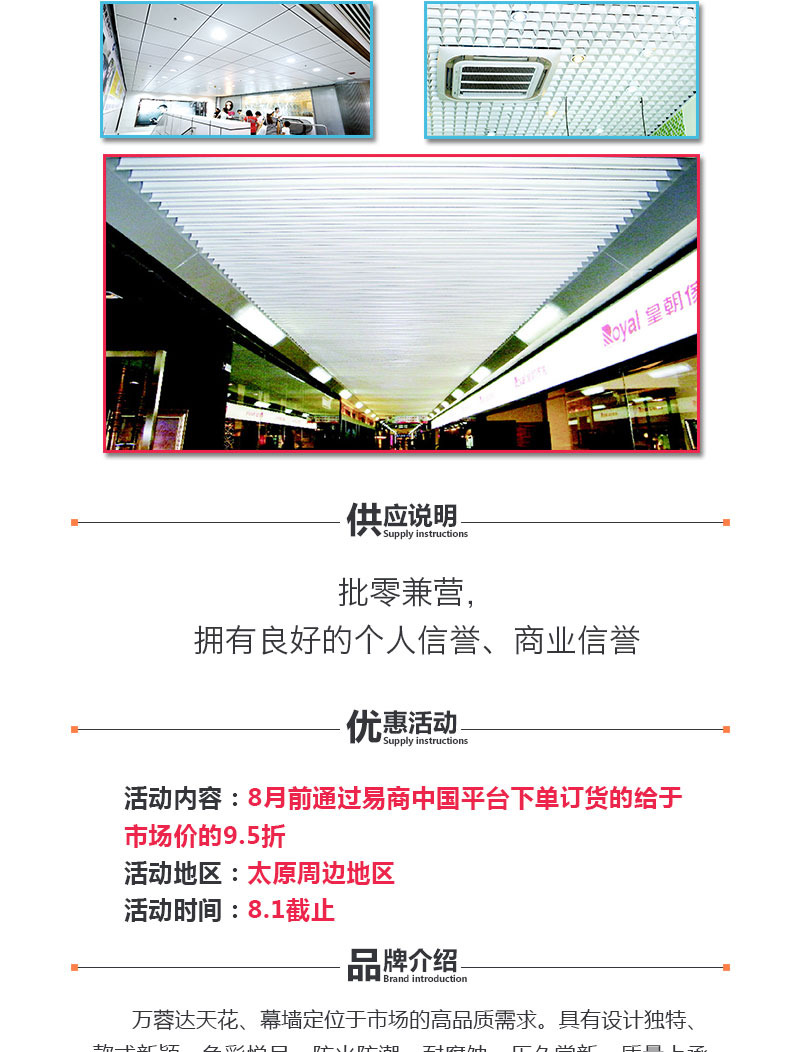 【内容摘要】万蓉达天花、幕墙定位于市场的高品质需求。具有设计独特、款式新颖、色彩悦目、防火防潮、耐腐蚀、历久常新、质量上承等特点。为设计师们构建—个现代化艺术新空间,提供最好的天花、幕墙装饰材料,可以淋漓尽致地表达出设计师的设计意念。