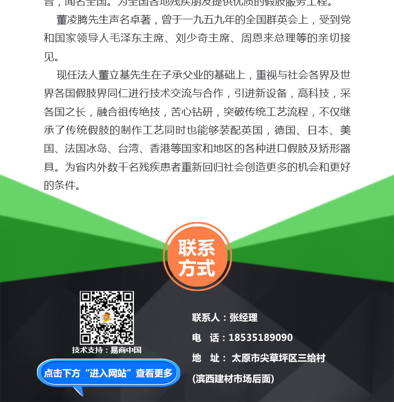 【内容摘要】太原腾悦假肢矫形康复(原太原康复假肢厂)有限公司假肢服务部,创建于1985年至今三十余年的历史。由山西省荣军假肢厂创始人董凌腾先生创办。我公司是山西省民政厅审批合格的专业假肢制作单位,属“中国假肢矫形器协会”(现已更名为“中国康复器具协会”)会员单位,我公司技师不但毕业于专业院校,而且拥有中国人事部和民政部颁发注册的《中华人民共和国假肢制作师执业资格证书》。技术力量在省内首屈一指。