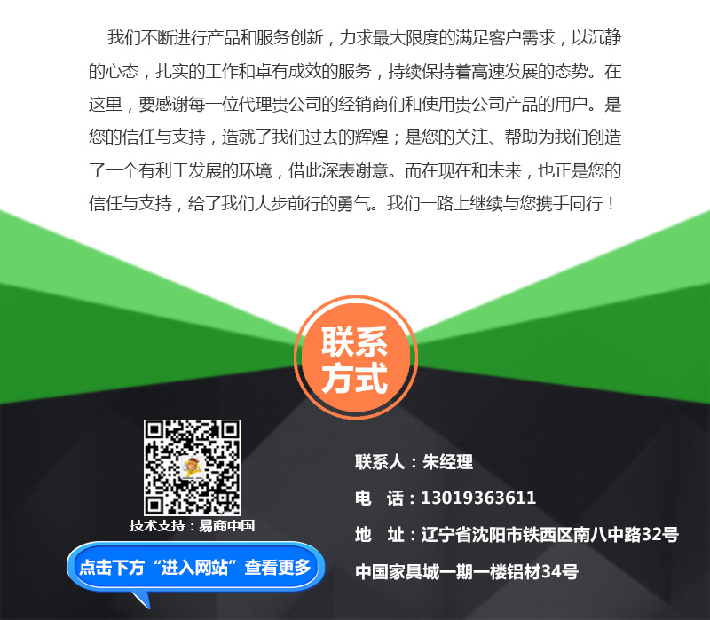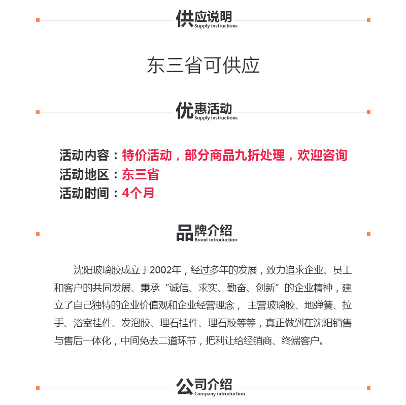 【内容摘要】沈阳玻璃胶成立于2002年,经过多年的发展,致力追求企业、员工和客户的共同发展、秉承“诚信、求实、勤奋、创新”的企业精神,建立了自己独特的企业价值观和企业经营理念, 主营玻璃胶、地弹簧、拉手、浴室挂件、发泡胶、理石挂件、理石胶等等,真正做到在沈阳销售与售后一体化,中间免去二道环节,把利让给经销商、终端客户。