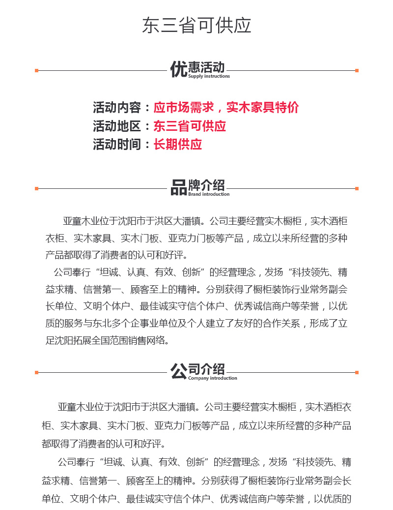 【内容摘要】亚童木业位于沈阳市于洪区大潘镇。公司主要经营实木橱柜,实木酒柜衣柜、实木家具、实木门板、亚克力门板等产品,成立以来所经营的多种产品都取得了消费者的认可和好评。 公司奉行“坦诚、认真、有效、创新”的经营理念,发扬“科技领先、精益求精、信誉第一、顾客至上的精神。分别获得了橱柜装饰行业常务副会长单位、文明个体户、最佳诚实守信个体户、优秀诚信商户等荣誉,以优质的服务与东北多个企事业单位及个人建立了友好的合作关系,形成了立足沈阳拓展全国范围销售网络。