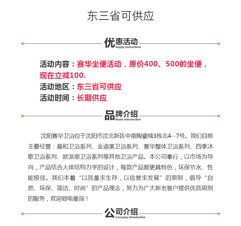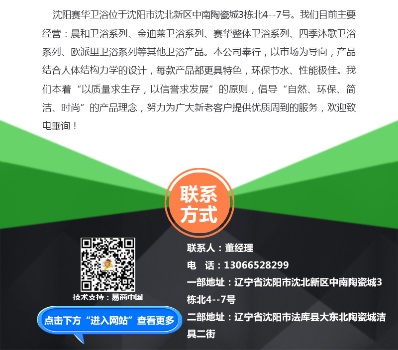 【内容摘要】沈阳赛华卫浴位于沈阳市沈北新区中南陶瓷城3栋北4--7号。我们目前主要经营:晨和卫浴系列、金迪莱卫浴系列、赛华整体卫浴系列、四季沐歌卫浴系列、欧派里卫浴系列等其他卫浴产品。本公司奉行,以市场为导向,产品结合人体结构力学的设计,每款产品都更具特色,环保节水、性能极佳。我们本着“以质量求生存,以信誉求发展”的原则,倡导“自然、环保、简洁、时尚”的产品理念,努力为广大新老客户提供优质周到的服务,欢迎致电垂询!